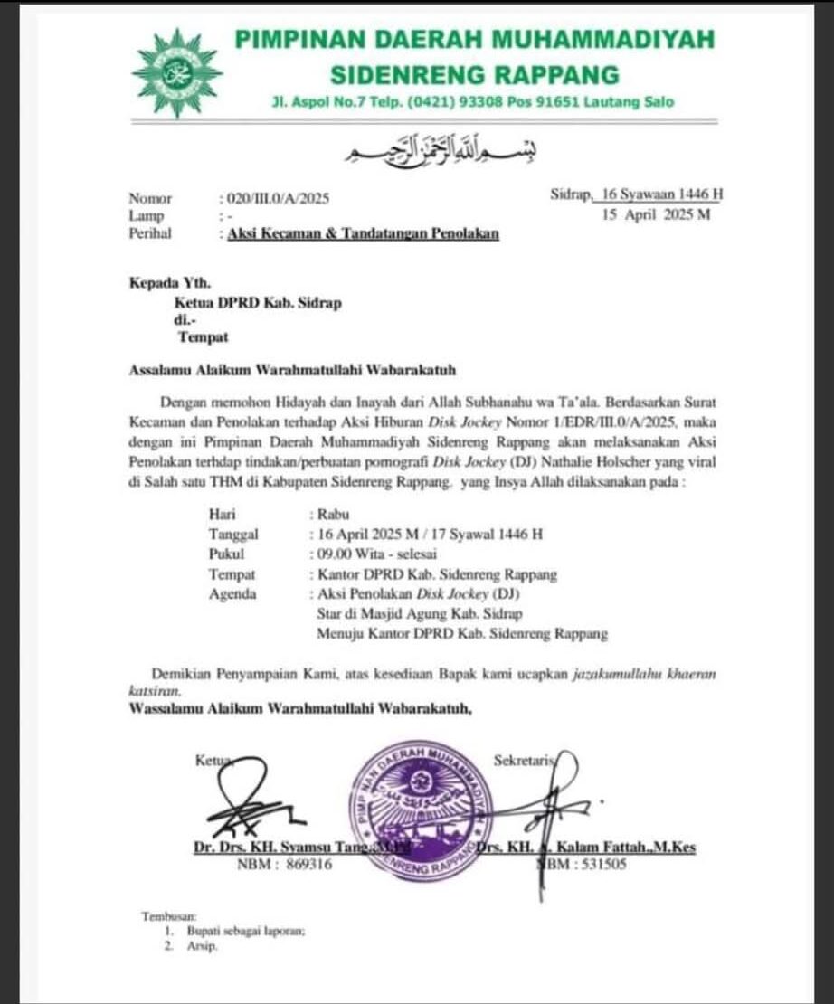 Melalui surat resmi bernomor 1/EDR/III.0/A/2025, Muhammadiyah mengecam keras pertunjukan yang dinilai bertentangan dengan nilai-nilai keislaman, budaya lokal, serta semangat program “Sidrap Religius” yang tengah diusung pemerintah daerah.