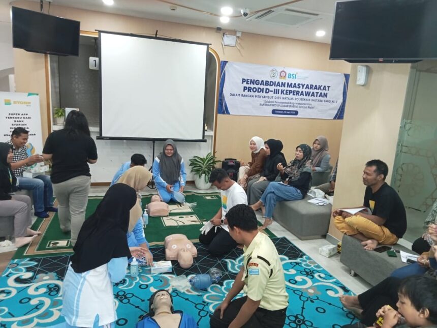 TARAKAN – Prodi D3 Keperawatan Politeknik Kaltara menggelar kegiatan pengabdian masyarakat bertajuk edukasi Penanganan Kegawatdaruratan: Bantuan Hidup Dasar (BHD) bagi karyawan Bank Syariah Indonesia Kantor Cabang Tarakan. Kegiatan yang dilaksanakan pada Sabtu, 10 Mei 2025 pukul 08.00 WIB ini bertujuan meningkatkan kemampuan pertolongan pertama pekerja di tempat kerja untuk menghadapi situasi henti jantung mendadak dan kegawatdaruratan medis lainnya.