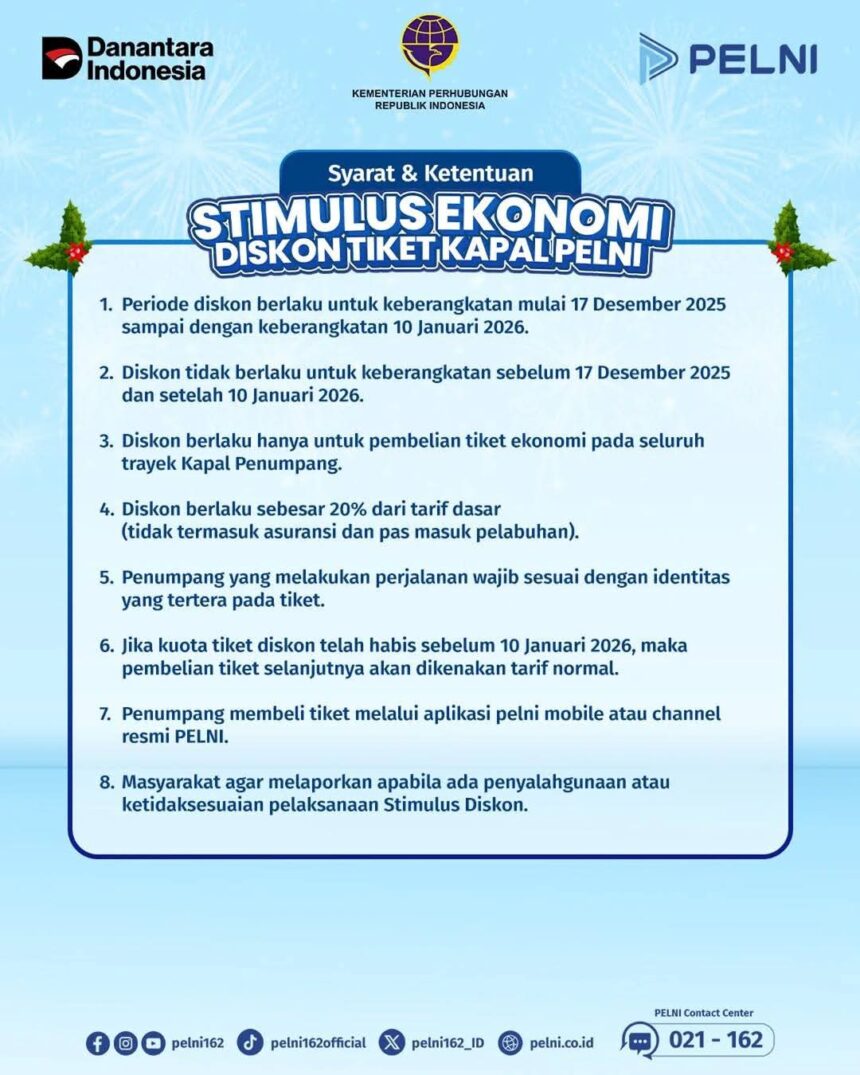 PT Pelayaran Nasional Indonesia atau PT PELNI (Persero) menerima penugasan dari program stimulus ekonomi berupa diskon tiket untuk kapal penumpang kelas ekonomi. Sekretaris Perusahaan PELNI Evan Eryanto mengatakan, penjualan tiket dengan potongan diskon akan dimulai pada Jumat (21/11) untuk periode keberangkatan terhitung tanggal 17 Desember 2025 hingga 10 Januari 2026. “Berlaku untuk seluruh tujuan atau pelabuhan yang disinggahi kapal penumpang menggunakan kelas ekonomi,” ujar Evan.